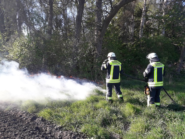 Brand im freien / Freifläche klein In einem Waldstück im Ortsbereich brannten ca. 15qm Wald und Wiesenfläche. Das Feuer war gerade soweit vorgedrungen damit die ersten Bäume und Sträucher durch den Wind angetrieben ebenfalls Feuer fingen. Als die ersten Einsatzkräfte an der Einsatzstelle eintrafen begann der Angriffstrupp unverzüglich mit der Brandbekämpfung mit dem Schnellangriff und verhinderte so ein Übergreifen auf weitere Waldfläche.