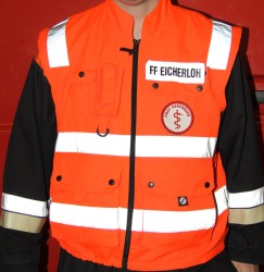 Den Ausgebildeten First-Responder-Sanitäter erkennen sie an der Helmkennzeichnung schwarzer Äskulap und an der Einsatzweste über der Feuerwehreinsatzkleidung.