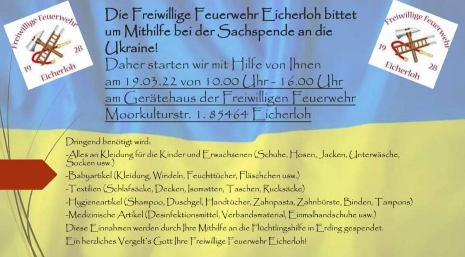 Sachspenden für die Ukraine Die Feuerwehr Eicherloh bittet um Mithilfe bei der Sachspenden Sammlung für die Ukraine. Am 19.3.22 zwischen 10 und 16 Uhr werden Sachspenden am Feuerwehrhaus Eicherloh entgegen genommen, diese werden im Anschluss an die Flüchtlingshilfe Erding übergeben und weiter Verteilt. -> Anhang 1  |