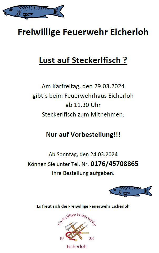 Steckerlfisch zum Mitnehmen bei der FFW Eicherloh Am Karfreitag, den 29.03.2024 gibts beim Feuerwehrhaus Eicherloh ab 11:30 Uhr Steckerlfisch zum Mitnehmen. Nur auf Vorbestellung!!! Ab Sonntag den 24.03.2024 können Sie unter der Tel. Nr. 0176/45708865 Ihre Bestellung aufgeben. Es freut sich die Freiwillige Feuerwehr Eicherloh -> Anhang 1  |