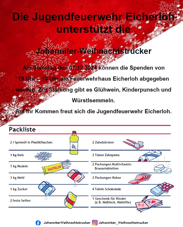 Der Johanniter-Weihnachtstruck kommt... Die Jugendfeuerwehr Eicherloh unterstützt die Johanniter-Weihnachtstrucker. Am Samstag den 07.12.2024 können Spenden von 15 Uhr bis 19 Uhr am Feuerwehrhaus abgegeben werden. Zur Stärkung gibt es Glühwein, Kinderpunsch und Würstlsemmeln. Anbei eine Packliste von dringend benötigten Waren und Gegenständen. Selbstverständlich muss nicht komplett alles davon gespendet werden. Wir freuen uns über jeden einzelnen Artikel. -> Anhang 1  |